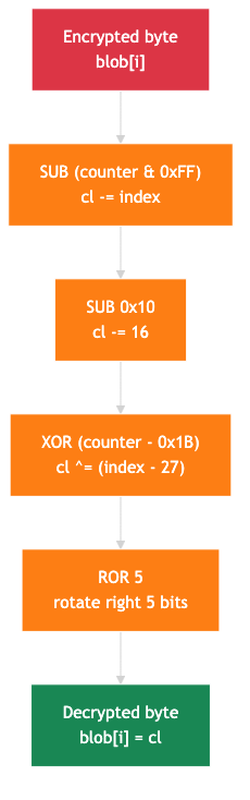 SUB counter, SUB 16, XOR (counter-27), rotate right 5 bits. Applied to every byte of the 3.2MB blob.