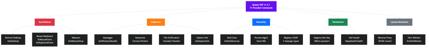 [ProtoContract]and[ProtoMember]attributes with fixed integer field IDs. These field IDs are compiled into the binary as constants. A YARA rule matching the ProtoBuf registration pattern (the specific combination of field IDs across multiple message types) would detect any Quasar v1.4.1 build regardless of CJK obfuscation.